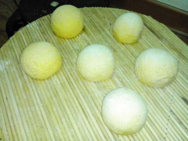 “我们要将面团分成一个个小剂子,擀成圆形,再在上面放上玉米粒。”阿姨将一个个小剂子擀成圆形,然后在中间放上几颗翠绿的玉米粒。